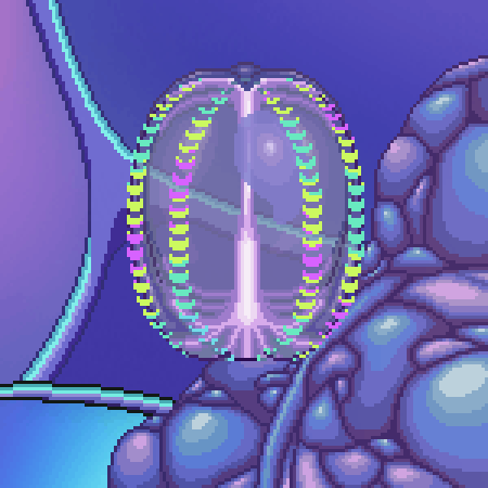 I just wanted to share with you one of the jellyfish enemy animations I’ve been working on. I’ve loved looking at images and videos of comb jellies and the cool diffraction effect their cilia create. They look like little gems in the water! When Dustin and I went to the aquarium in Osaka I got to see the effect with my own eyes for the first time. Even though time constraints meant I couldn’t put jellyfish in the background art, I still get to animate their lovely cilia in the enemy sprites!